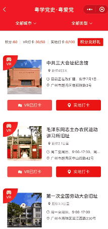 廣大黨員干部群眾隨時(shí)隨地拿起手機(jī)掃描二維碼或在微信小程序搜索“打卡廣東紅”,即可進(jìn)入頁(yè)面,通過(guò)線上或線下實(shí)地打卡等方式,馬上進(jìn)入上百個(gè)重要地標(biāo)、重要革命遺址、重大事件發(fā)生地、革命紀(jì)念館等參觀學(xué)習(xí),或看或聽,或進(jìn)或出,輕松自如。