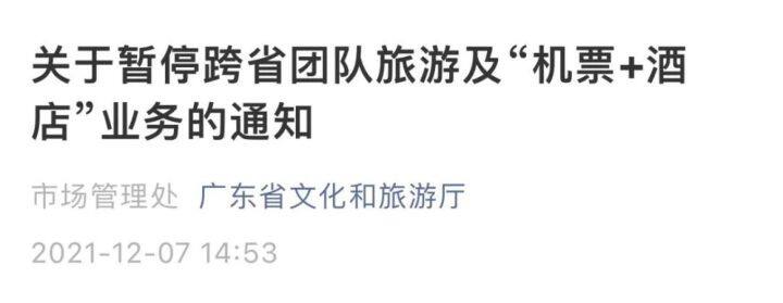 其中提到,12月3日起,各旅行社及在線旅游企業(yè)立即暫停經(jīng)營跨省團隊旅游及“機票+酒店”業(yè)務(wù)。原文如下↓↓↓