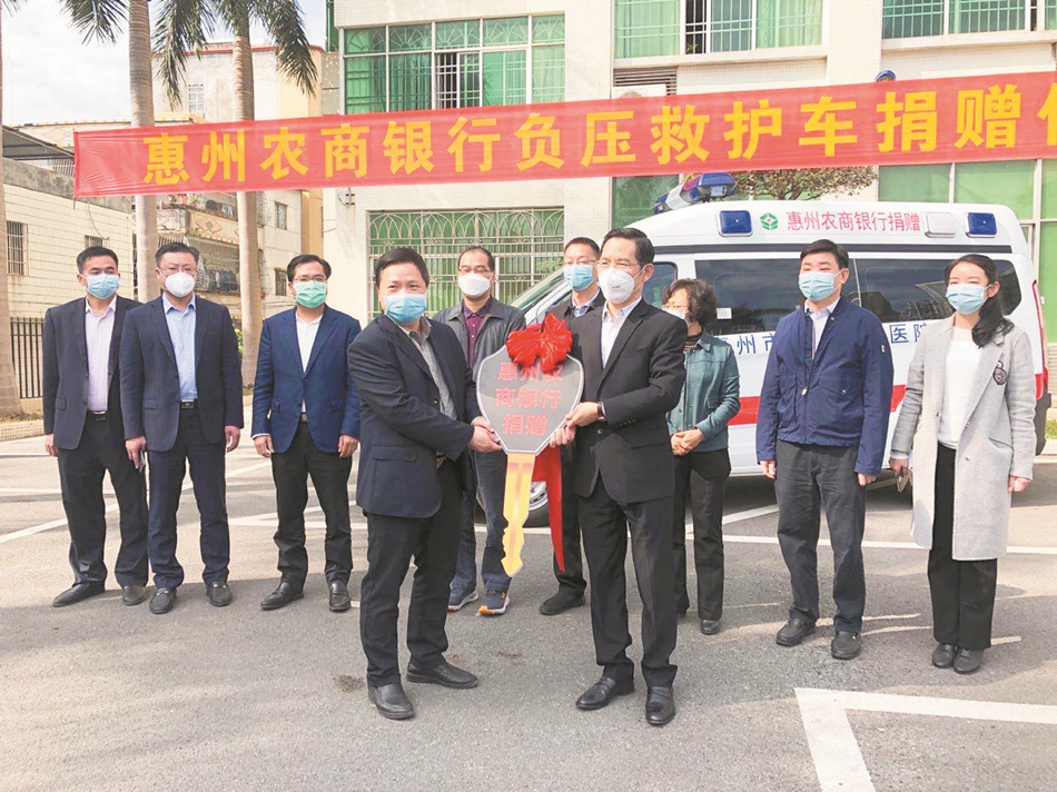 惠州農(nóng)商銀行向惠州市第六人民醫(yī)院捐贈負壓救護車。 惠州農(nóng)商銀行供圖