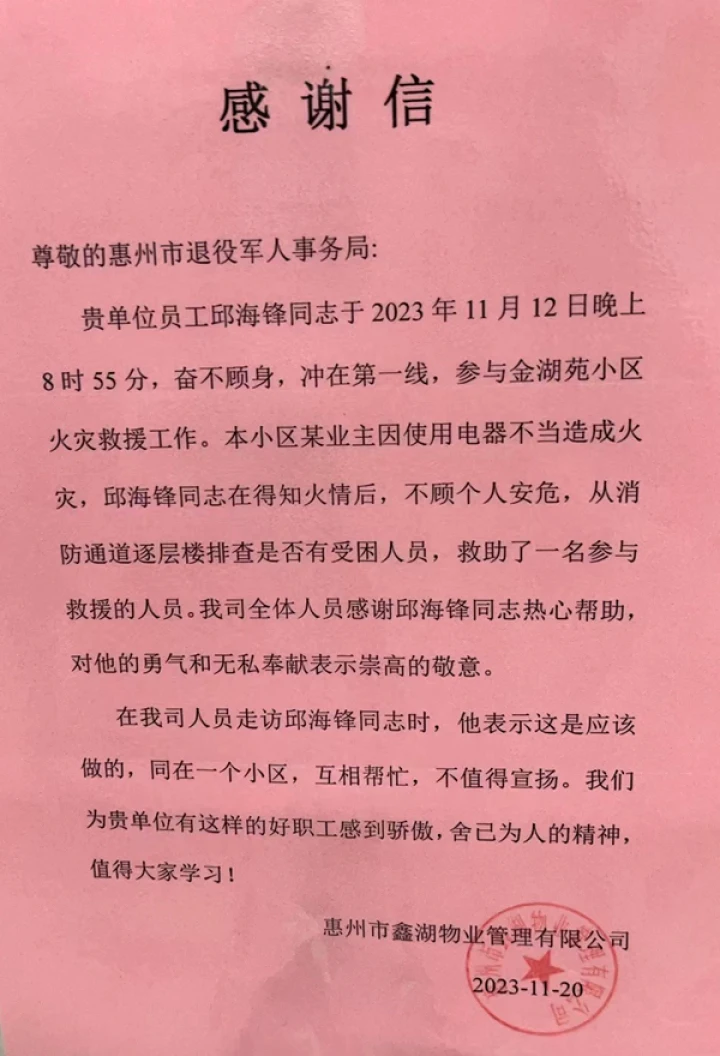 日前,一封來自小區(qū)物業(yè)的感謝信,讓惠州市退役軍人服務(wù)中心主任邱海鋒勇闖火場(chǎng)解救被困老人的事跡“藏不住了”。此前邱海鋒遇火災(zāi)逆向而行,緊急疏散鄰居,逐層搜索排查,勇闖火場(chǎng)解救被困老人,被小區(qū)業(yè)主親切稱為“新時(shí)代最美鄰居”。