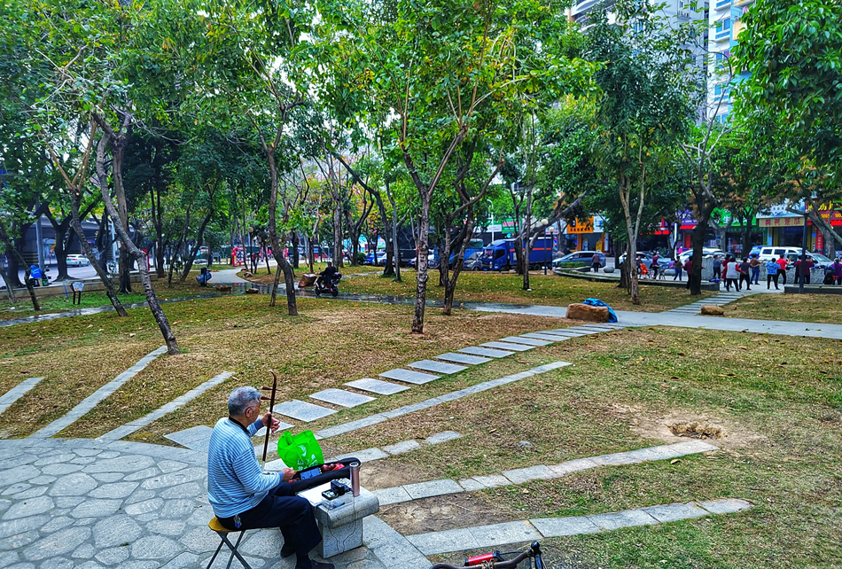 每天下午三時(shí)至五時(shí),在市區(qū)上排龍豐公園,總能看見(jiàn)72歲的市民鄧光宏在玩樂(lè)器的身影!斑@個(gè)口袋公園環(huán)境很好,我和一幫老朋友在公園里休閑娛樂(lè)也很盡興!