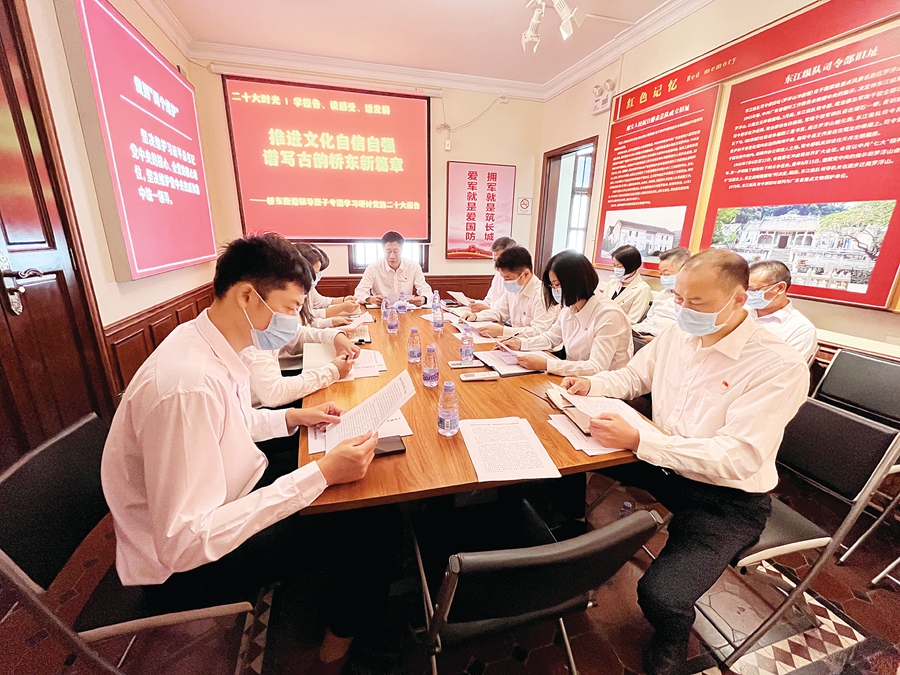 10月20日,橋東街道組織黨員干部走進東湖旅店,在紅色基地里讀黨的二十大報告、談感受、話發(fā)展!吧钊雽W(xué)習(xí)黨的二十大報告后,我們更加擰緊了保護和傳承本土文化的發(fā)條。橋東作為歸善古城、東坡寓居所在地,我們要傳承弘揚歸善文化、東坡文化、商埠文化,延續(xù)歷史文脈,堅定文化自信!睒驏|街道黨工委書記楊惠強說,接下來橋東將推動以文化人、以文促旅、以旅彰文、以旅富民,打造“一核兩帶六區(qū)”旅游島,以實際行動貫徹落實黨的二十大精神。