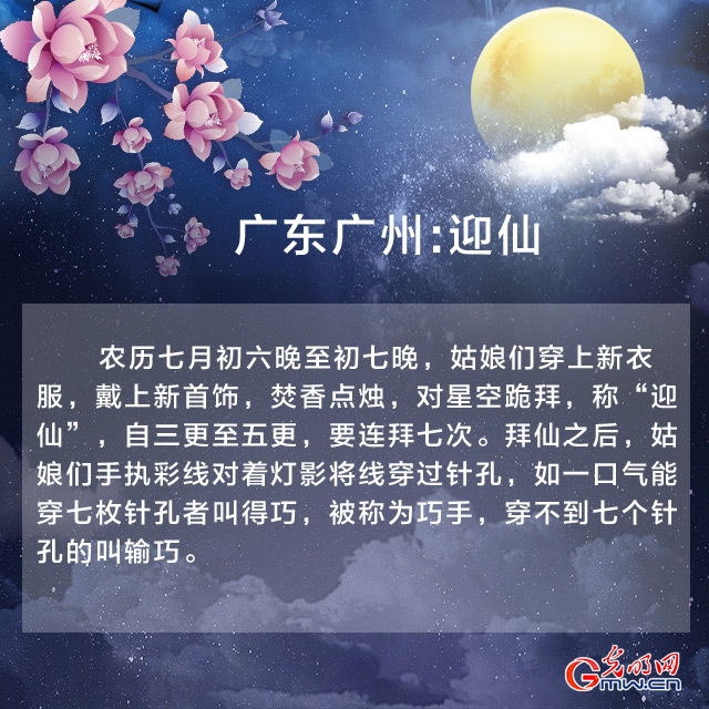 農(nóng)歷七月初六晚至初七晚,姑娘們穿上新衣服,戴上新首飾,焚香點(diǎn)燭,對(duì)星空跪拜,稱為“迎仙”,自三更至五更,要連拜七次。拜仙之后,姑娘們手執(zhí)彩線對(duì)著燈影將線穿過(guò)針孔,如一口氣能穿七枚針孔者叫得巧,被稱為巧手,穿不到七個(gè)針孔的叫輸巧。