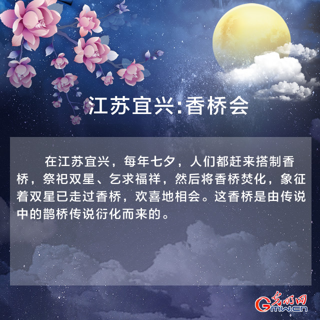 在江蘇宜興,每年七夕,人們都趕來(lái)搭制香橋,祭祀雙星、乞求福祥,然后將香橋焚化,象征著雙星已走過(guò)香橋,歡喜地相會(huì)。這香橋是由傳說(shuō)中的鵲橋傳說(shuō)衍化而來(lái)的。