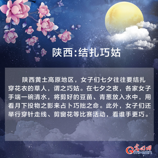 陜西黃土高原地區(qū),女子們七夕往往要結(jié)扎穿花衣的草人,謂之巧姑。在七夕之夜,各家女子手端一碗清水,將剪好的豆苗、青蔥放入水中,用看月下投物之影來(lái)占卜巧拙之命。此外,女子們還舉行穿針走線、剪窗花等比賽活動(dòng),看誰(shuí)手更巧。