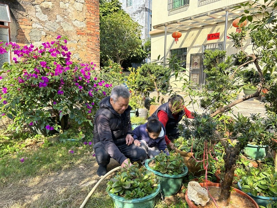 莫水潤(rùn)與家人打理庭院里的綠植。 本組圖片 惠州日?qǐng)?bào)記者黃宇翔 通訊員龍融心 攝