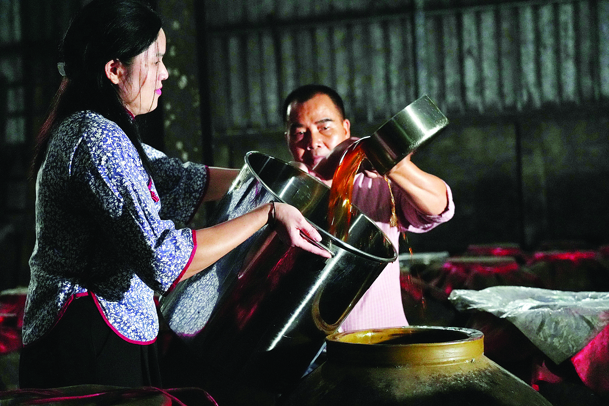 楊容添和妻子毛偉英將釀好的酒拿出來(lái)銷售。