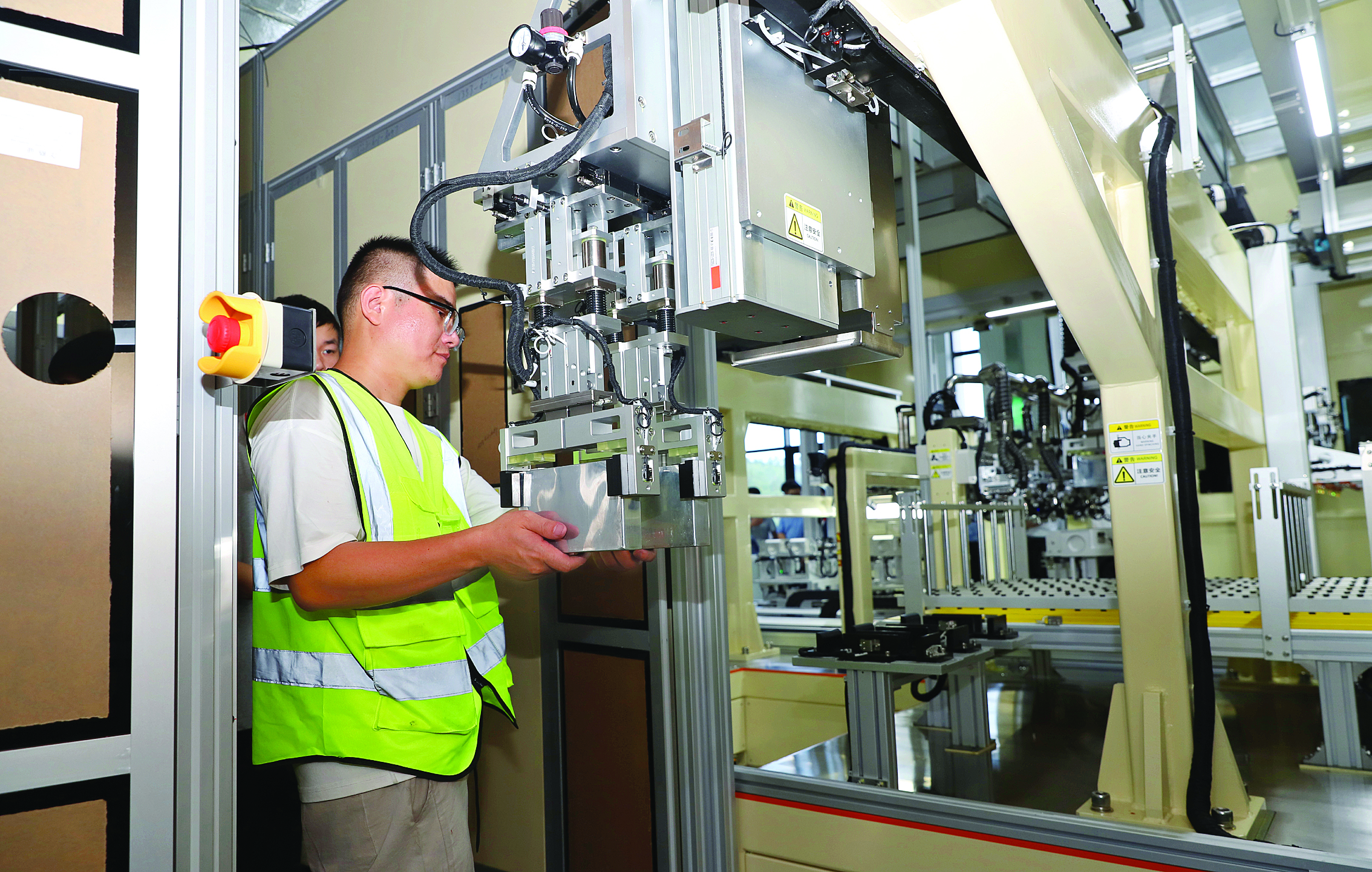 金源機(jī)器人公司通過(guò)自研AI機(jī)器人技術(shù),實(shí)現(xiàn)“用機(jī)器人生產(chǎn)機(jī)器人電池”;葜萑?qǐng)?bào)記者鐘暢新 攝