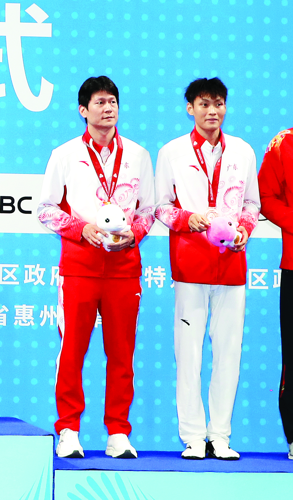 廣東隊選手嚴(yán)磊(右)和教練上臺領(lǐng)獎。 惠州日報記者鐘暢新 攝
