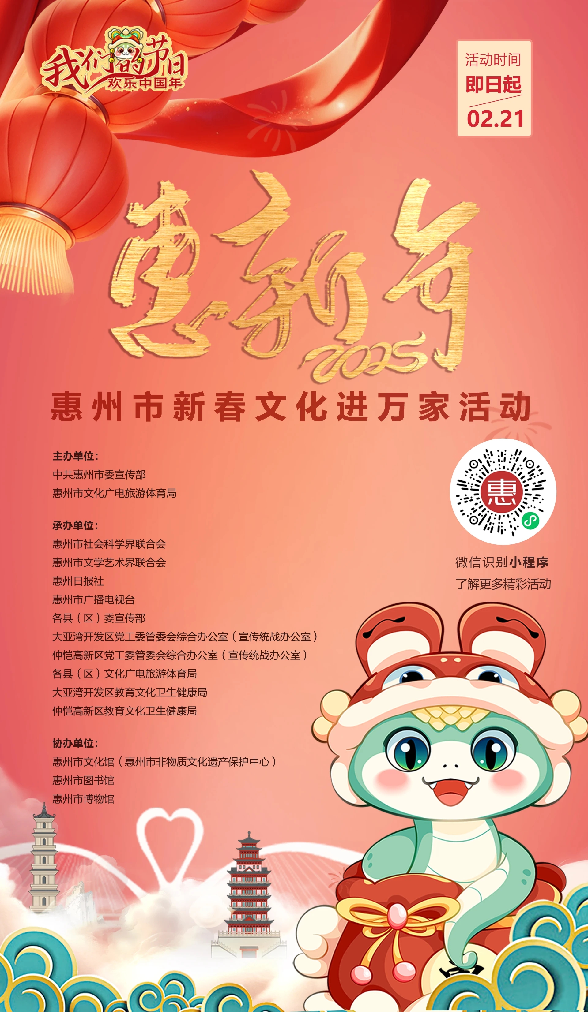 本次活動(dòng)由中共惠州市委宣傳部、惠州市文化廣電旅游體育局主辦,旨在積極推動(dòng)文化傳承發(fā)展和繁榮興盛,深入實(shí)施2025年“我們的中國夢(mèng)——文化進(jìn)萬家”活動(dòng),以形式多樣的文化活動(dòng)營造歡樂吉祥、溫暖和順的濃厚節(jié)日氛圍。