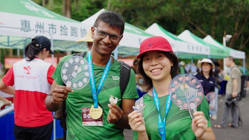 有了兩位“小網(wǎng)紅”的助力,選手們參與環(huán);顒(dòng)的熱情更加高漲了。大家將垃圾帶回終點(diǎn)后,迫不及待地領(lǐng)取文創(chuàng)產(chǎn)品。來(lái)自澳大利亞的Ravi Sundar第一次在中國(guó)參加這么大型的徒步活動(dòng),在領(lǐng)到“游游”“玩玩”的文創(chuàng)產(chǎn)品后,他開心地與女朋友拍照留念:“這個(gè)公仔形象很可愛!