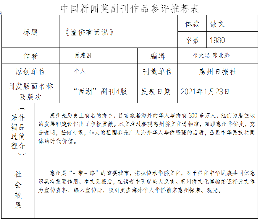 我就申報(bào)的《潼僑有話說(shuō)》作品參評(píng)本屆中國(guó)新聞獎(jiǎng)作如下承諾: