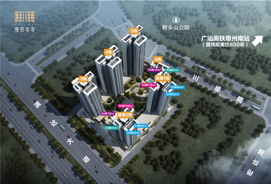 錦薈年華花園是目前距離惠州南站相對較近的在售新房項目。從惠州南站站臺前廣場上即可看到項目全面封頂?shù)慕ㄖ䴓求w。