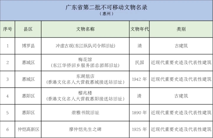 惠州新增6處省級(jí)革命文物。日前,廣東省文旅廳公布廣東省第二批革命文物名錄,69處不可移動(dòng)文物、408件/套可移動(dòng)文物入選。其中,惠州6處省文保單位榜上有名,即為沖虛古觀(東江縱隊(duì)司令部舊址)、梅花館(東江華僑回鄉(xiāng)服務(wù)團(tuán)總團(tuán)部舊址)、東湖旅店(香港文化名人大營救惠城接送站舊址)、榴兆樓(香港文化名人大營救惠陽接送站舊址)、崇雅書院舊址、廖仲愷先生之碑。