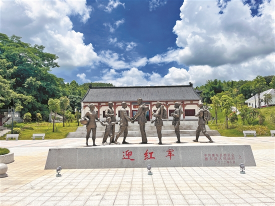 栩栩如生的雕塑描繪著雁湖村村民攜妻帶兒迎紅軍的場(chǎng)景