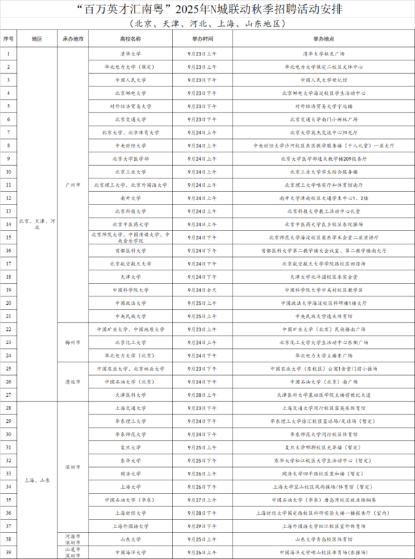 根據(jù)“百萬英才匯南粵”行動部署,2025年N城聯(lián)動秋季招聘活動將于9月下旬啟動;顒訃@“粵聚英才、粵見未來”主題,由廣東省委、省政府聯(lián)合教育部主辦,廣東省委人才辦、省人力資源社會保障廳、省教育廳以及廣東省21個地級以上市黨委、政府,廣東省委橫琴工委、廣東省政府橫琴辦承辦,以“萬企進百!备咝鲂问,線上線下組織逾1萬家用人單位,到全國超100所重點高校,主動上門邀約優(yōu)秀高校畢業(yè)生來粵就業(yè)創(chuàng)業(yè)。