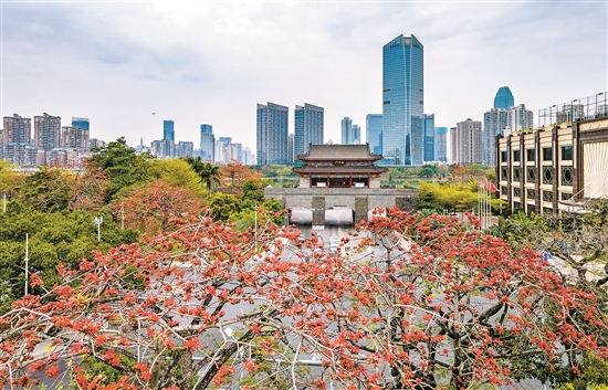 在千年鵝城的街頭上、西湖、紅花湖、西枝江、東江兩岸等地的木棉花競相綻放,一片盎然春色,為鵝城增添一道亮麗的風(fēng)景線。鮮艷的花朵好似一團(tuán)團(tuán)火苗在枝頭燃燒、跳躍,格外搶眼,成片的火紅木棉和旁邊建筑相映成景,美不勝收。