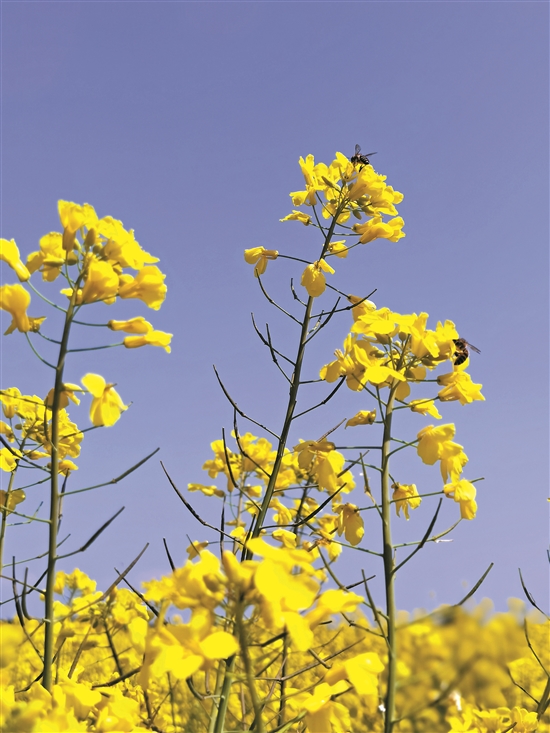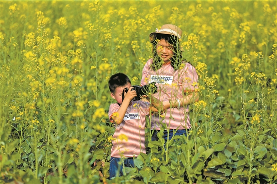 一片片金黃色的油菜花開滿了田間地頭,黃色的花朵點綴在綠葉間,微風(fēng)拂過,搖曳生姿。金燦燦的油菜花還引來了無數(shù)小蜜蜂在花叢中“嗡嗡嗡”伴奏,好一派迷人的景象,令人賞心悅目,心曠神怡。趁著周末,不少的游客紛紛走出家門,在花叢中用鏡頭定格美好春光。