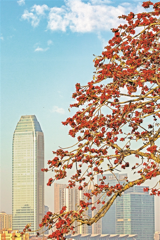 “最近聽說這邊的木棉開了,恰好出來活動活動!弊≡诟浇睦钅棠陶f,趁著上午天氣好,就拉著老伴出來散步賞花,順便撿一些木棉花回去曬干煲湯。望著枝頭上的木棉花,在藍(lán)天白云的托襯下,似乎更加火紅,更加鮮艷。紅艷艷的木棉花為城市增添了濃濃的生機。