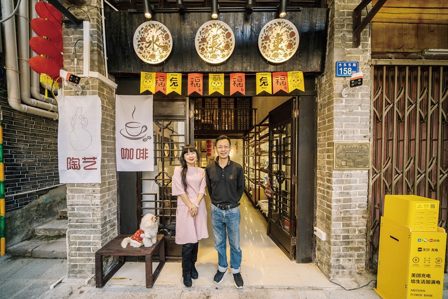 店主陳智揚(yáng)和妻子王以旋在水長東咖啡瓷藝館門前。