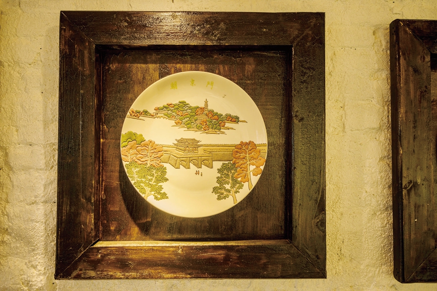 店面招牌用惠州彩瓷盤子堆彩“水”“長”“東”三字。