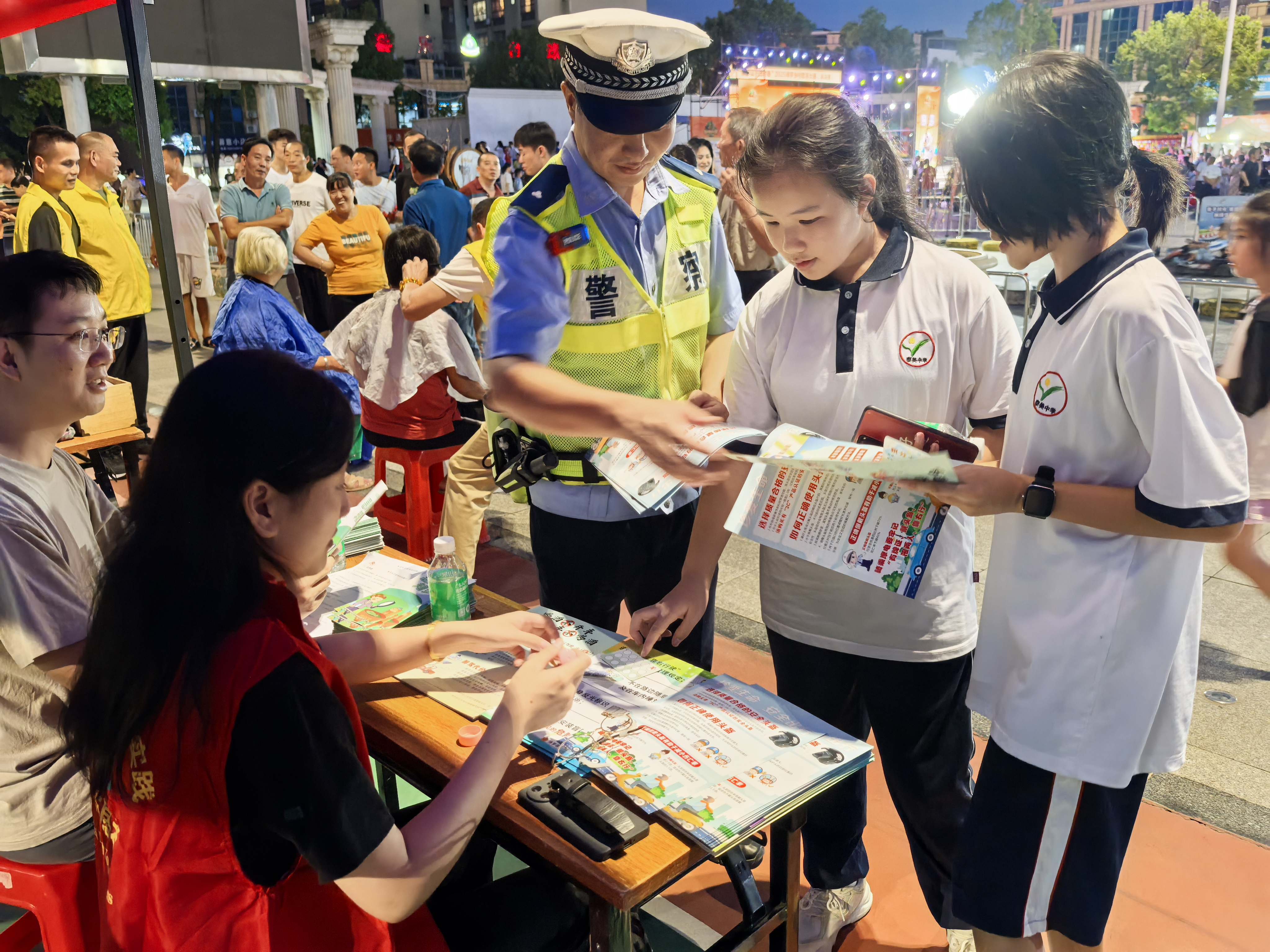 活動當(dāng)晚,6個主題宣傳攤位整齊排列,應(yīng)急、交通安全、禁毒、工會職工權(quán)益、婦聯(lián)、公共服務(wù)等領(lǐng)域志愿者化身攤主,通過“講解+互動”“案例+問答”的形式,用方言俚語、身邊故事把政策講“活”、道理說“透”。