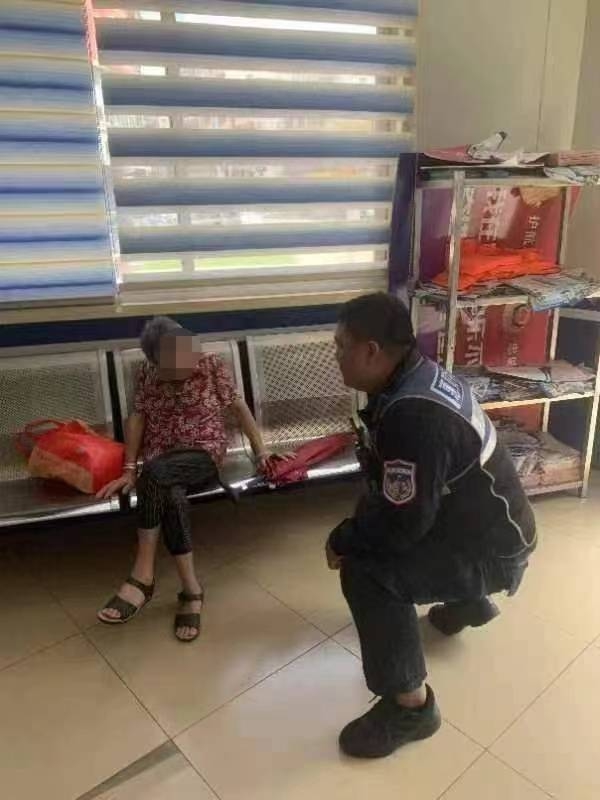 6月27日下午,惠州市惠陽區(qū)淡水街道,一位拄著拐杖的老太太來到石橋執(zhí)勤崗?fù)で笾,兩名巡警?duì)員巫惠聰、許德武接待了老人,眼看著老太太有點(diǎn)緊張,氣喘吁吁,兩人馬上讓老人坐下,并蹲在地上細(xì)心詢問老人的情況。老人姓李,她說自己早上出來散步迷路了。