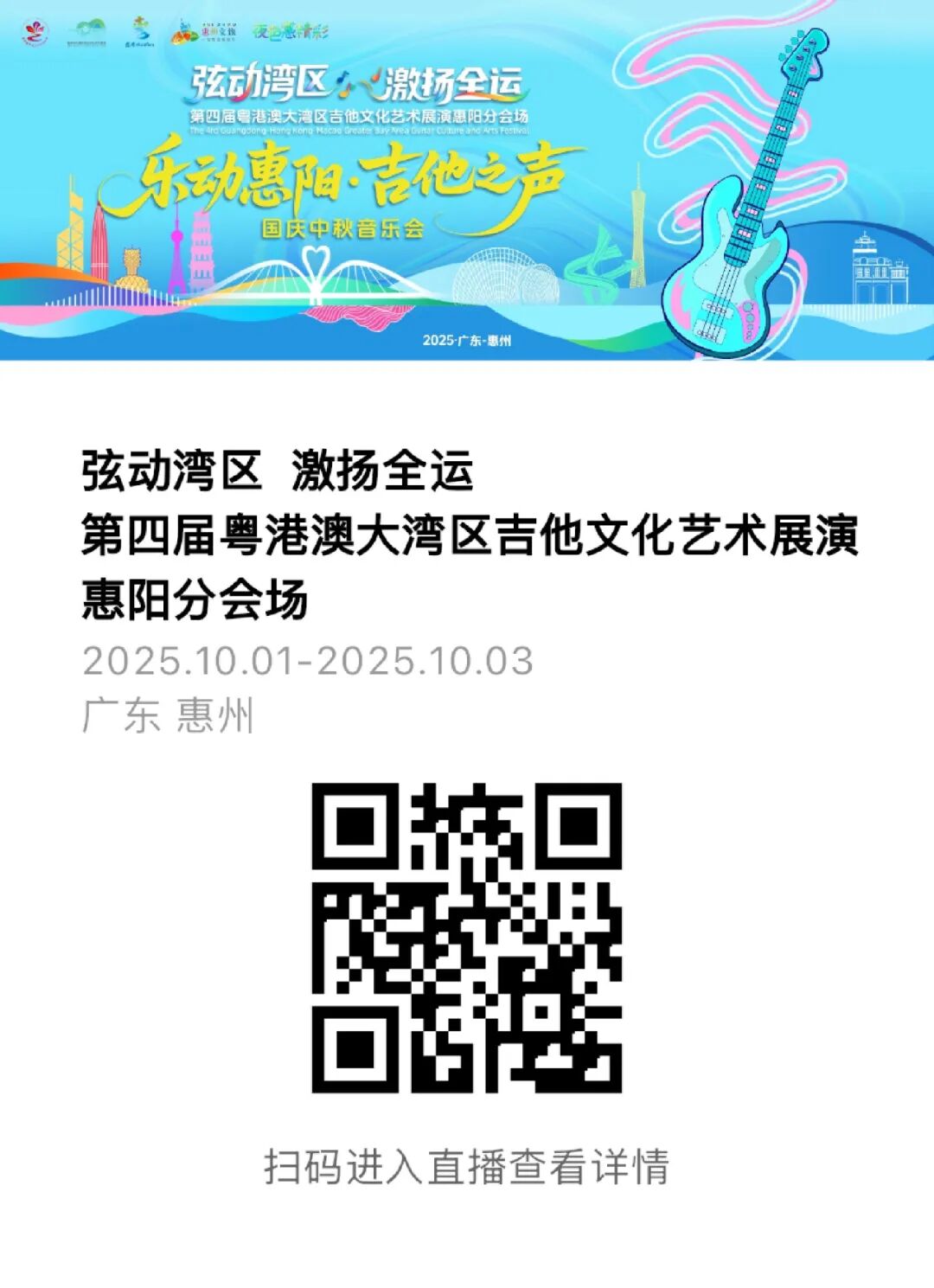 活動主題:“弦動灣區(qū) 激揚(yáng)全運(yùn)”第四屆粵港澳大灣區(qū)吉他文化藝術(shù)展演惠陽分會場——“樂動惠陽·吉他之聲”國慶中秋音樂會