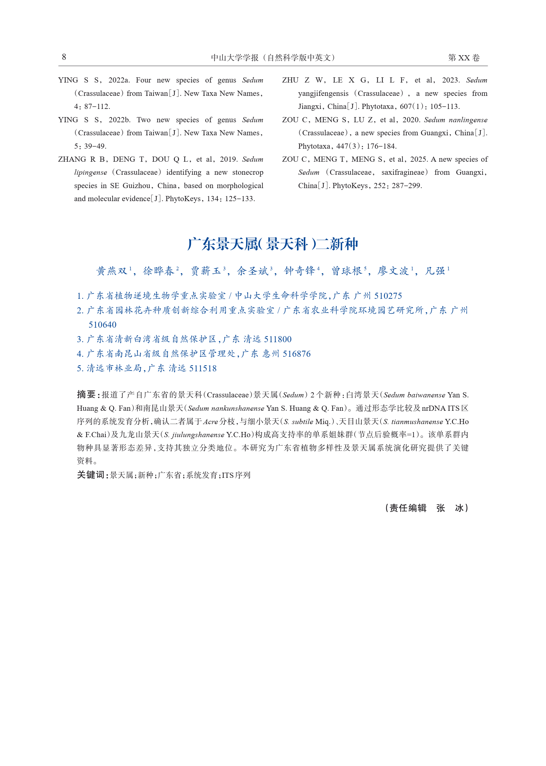 近日,廣東龍門南昆山省級(jí)自然保護(hù)區(qū)聯(lián)合中山大學(xué)生命科學(xué)學(xué)院、廣東省農(nóng)業(yè)科學(xué)院環(huán)境園藝研究所等單位的科研人員,在南昆山省級(jí)自然保護(hù)區(qū)發(fā)現(xiàn)了新物種,并命名——南昆山景天(Sedum nankunshanense Yan S. Huang & Q. Fan),相關(guān)成果于2025年10月在《中山大學(xué)學(xué)報(bào)(自然科學(xué)版中英文)》發(fā)表。