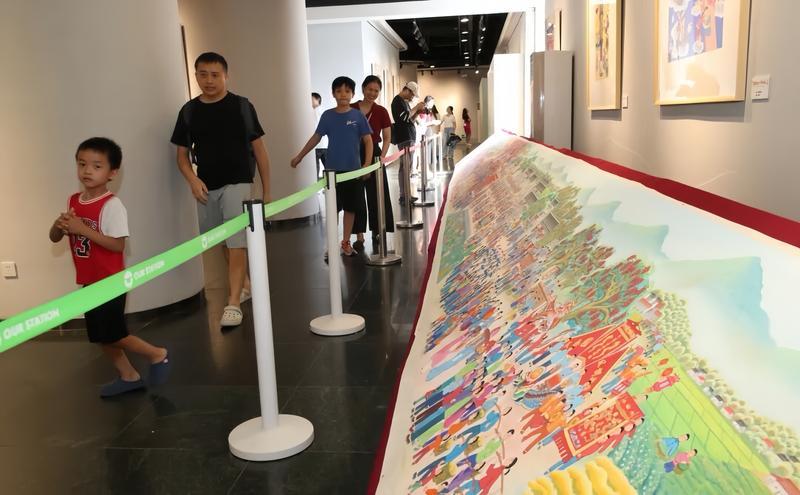 展廳內(nèi),一幅長13米、寬1米的農(nóng)民畫《非遺里的龍門》吸引市民紛紛駐足拍照,感嘆其創(chuàng)作之精妙、內(nèi)容之豐富。這幅由龍門縣文化廣電旅游體育局策劃出品,黃偉平、廖錦鋒、梁彩歡、駱雪芳、羅秀芳、劉少夏、蘇曉明7位畫家歷時半年創(chuàng)作的作品在本次展覽中首度公開展出。舞火狗、做棚、上燈、虎頭花燈、醒獅、春牛舞、舞龍、織帶仔、造紙、盒籮、釀酒、米餅、胡須雞、大籠糍、西溪筍等40多項非遺瑰寶躍然紙上,人物神態(tài)栩栩如生,四時風(fēng)俗熱鬧喜慶,山川景致清新宜人,堪稱龍門農(nóng)民畫版的“清明上河圖”。