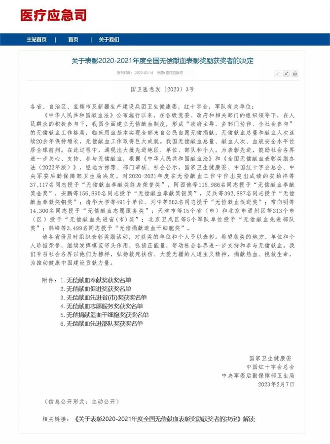 關(guān)于表彰2020-2021年度全國無償獻(xiàn)血