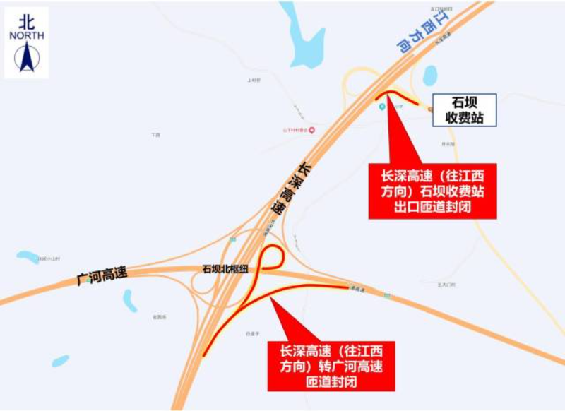 9月12日10:00-15日10:00,長深高速江西方向石壩北樞紐轉廣河高速匝道臨時封閉,禁止車輛通行;長深高速江西方向石壩收費站出口臨時封閉,禁止車輛通行。交通管制實施期間,途經車輛請?zhí)崆霸谙笊筋^立交轉韶惠高速再轉廣河高速或在麻陂收費站下高速繞行。
