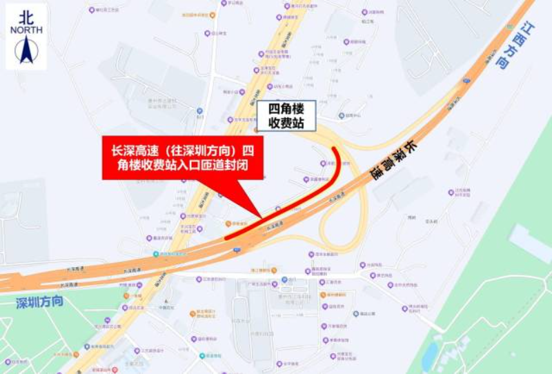 9月14日10:00-19日10:00。長深高速深圳方向四角樓收費站入口臨時封閉,禁止車輛通行。交通管制實施期間,途經車輛請?zhí)崆霸谔┟朗召M站上高速或繞行惠州北收費站。