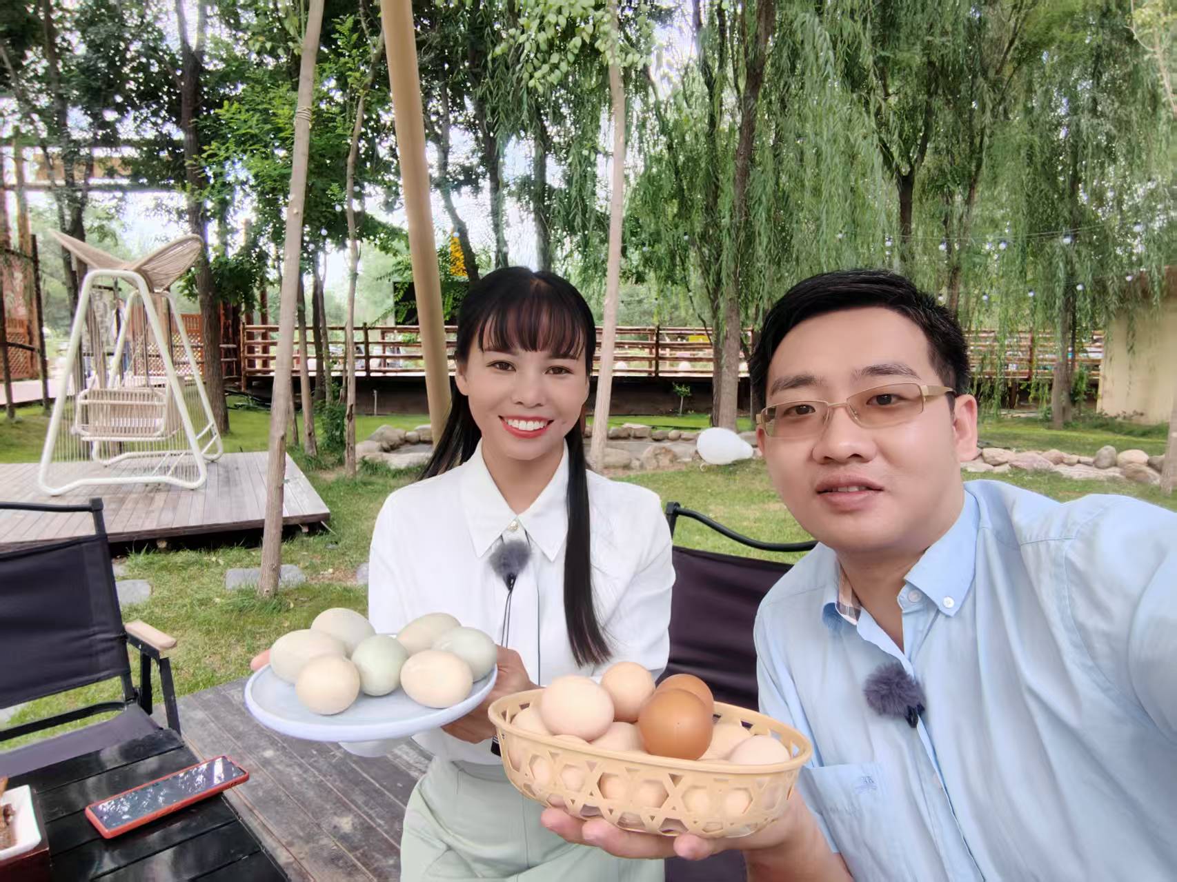 董平天(右)帶著惠州生產(chǎn)的鮮雞蛋與馬鈴薯蛋糕登上全國舞臺展示給全國觀眾。