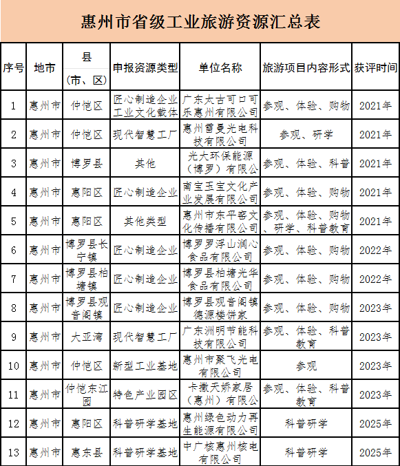 當前,惠州工業(yè)旅游呈現(xiàn)出多元化發(fā)展態(tài)勢;葜堇茁怆娍萍加邢薰、廣東洲明節(jié)能科技有限公司這樣科技感滿滿的超高清視頻顯示產品生產企業(yè),也有廣東太古可口可樂惠州有限公司、博羅羅浮山潤心食品有限公司、博羅縣柏塘光華食品有限公司這樣的傳統(tǒng)食品企業(yè)。還有此次入選的中廣核惠州核電有限公司、惠州綠色動力再生能源有限公司這樣的大型環(huán)保、發(fā)電項目。
