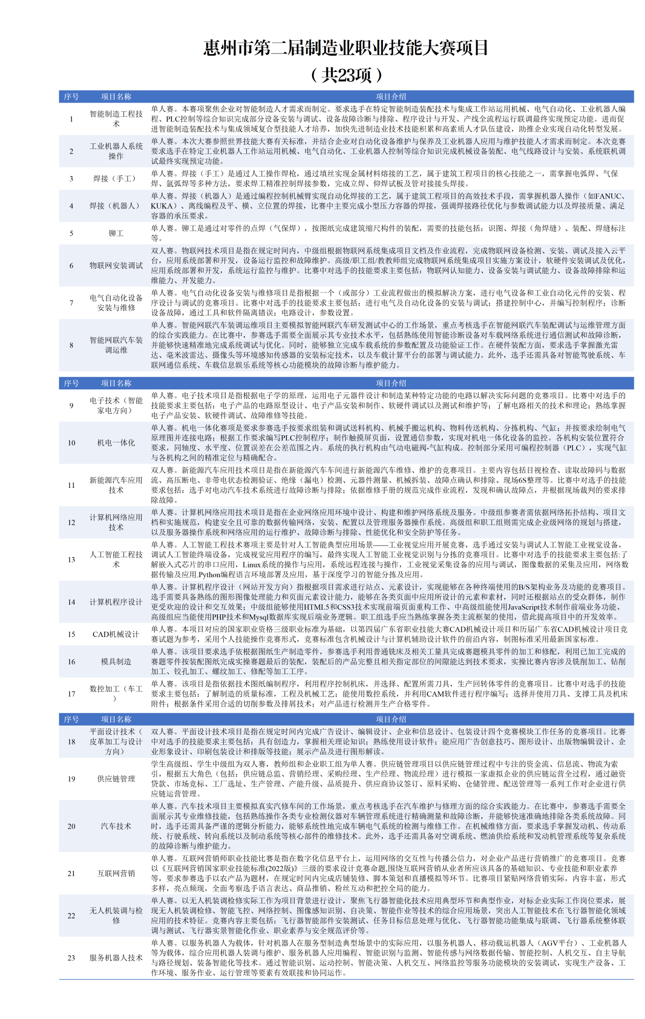 大賽緊密圍繞我市制造業(yè)當家戰(zhàn)略,聚焦制造業(yè)與電子信息產業(yè)、新能源與新型儲能產業(yè)、數(shù)據(jù)中心、未來產業(yè)與新興產業(yè)、傳統(tǒng)產業(yè)轉型升級,共設置23個競賽職業(yè)(工種)或項目,覆蓋惠州重點發(fā)展產業(yè)集群。