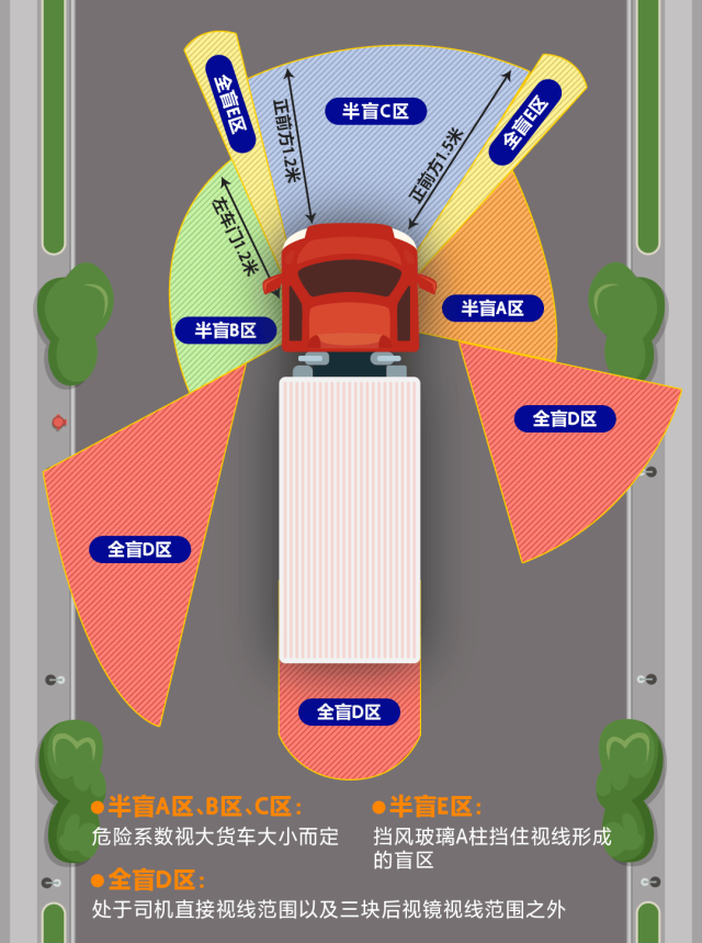大型車車頭較高,駕駛員視線與地面形成的角度較大,車頭正前方約2-3米范圍內、尤其是貼近車身的區(qū)域,駕駛員難以直接觀察到,若有行人或小型車輛停留,極易引發(fā)碰撞。