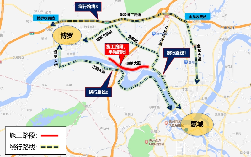 為避免施工期間帶來的交通擁堵,影響出行行程,惠州交管部門建議,博羅羅陽往返惠城的車輛,盡量選擇通過博羅大道東-金泉路-小金河大道、博羅大橋-江南大道、博羅收費站-G35濟廣高速-金龍收費站等線路繞行。