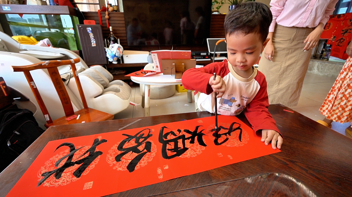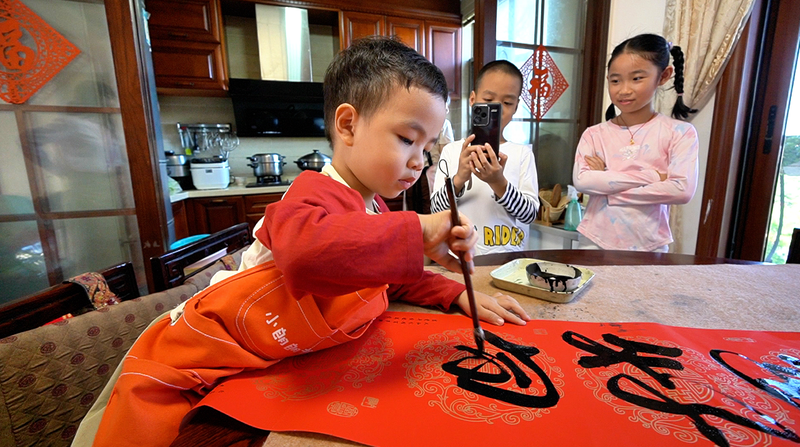 “吉祥如意好意來!”紅紙上,小手攥著毛筆翻飛,3歲的黃煊朗(小名朗朗)踮著腳站在椅子上,半個身子撲在餐桌前,蘸墨、落筆一氣呵成。雖握筆是幼齡寶寶常見的“握拳式”,但筆畫粗細有別、間架結(jié)構(gòu)規(guī)整,寫完上聯(lián)寫下聯(lián),最后補上橫批和“福”字,一套春聯(lián)“四件套”才算收尾——這份專注與功底,不僅讓央視《越戰(zhàn)越勇》的主持人連連驚嘆,更讓億萬網(wǎng)友直呼“文曲星下凡”。