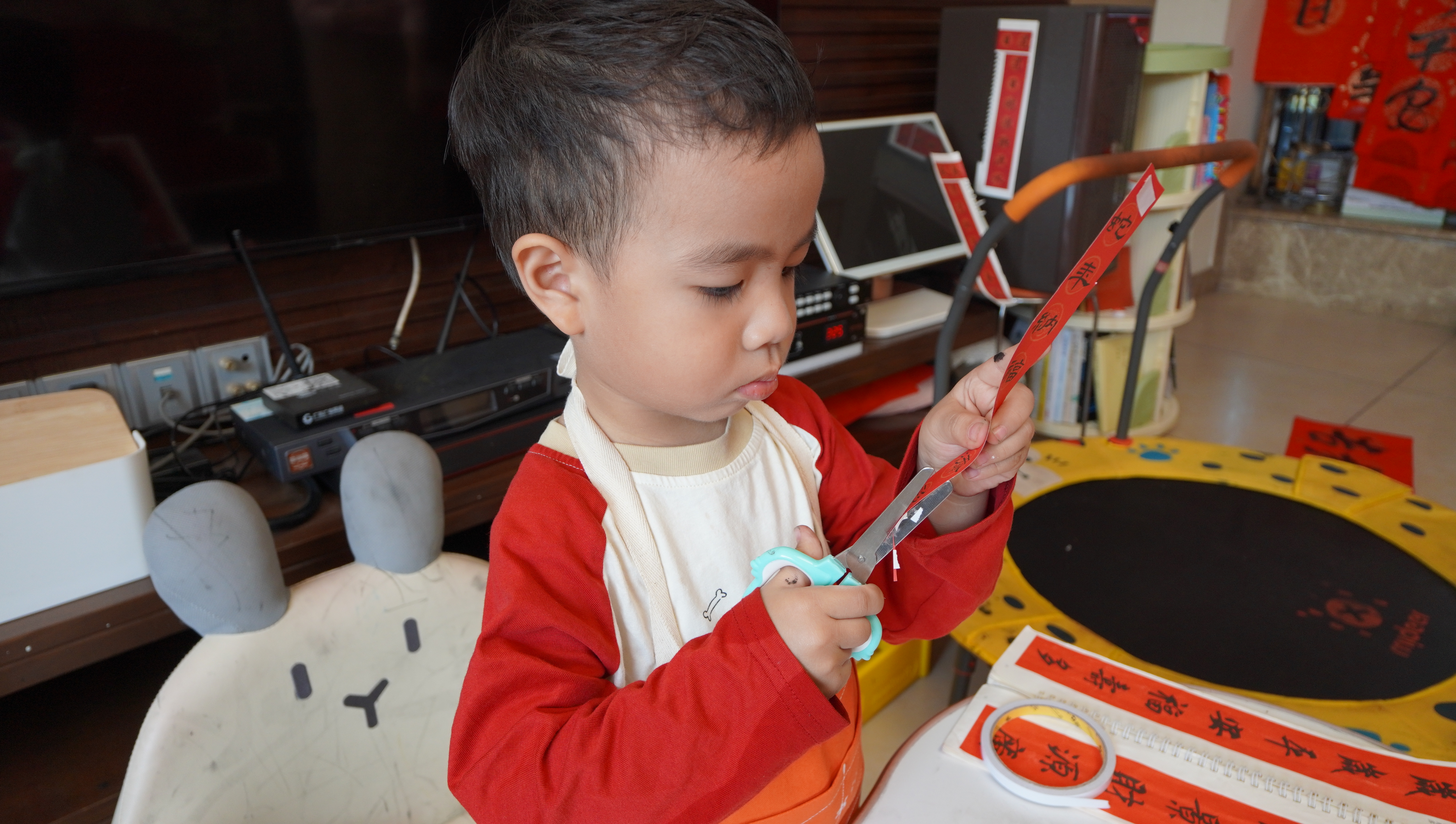 不同于多數(shù)小男孩癡迷小汽車、奧特曼,朗朗最愛的是逛文房四寶店和書店!八ㄟ^讀對聯(lián)已經(jīng)認識三四百字了,我喜歡顏真卿的字體,他卻偏愛趙孟頫的行書!比~雯婷笑著說,朗朗最近還愛上自己搭對聯(lián)?蛷d的一角,朗朗翻著小篆春聯(lián)書指讀:“梅花開五福,竹葉報三春”,再拿起小剪刀熟練地剪下來,貼到書房玻璃門,家人從不會干涉這份自由探索。