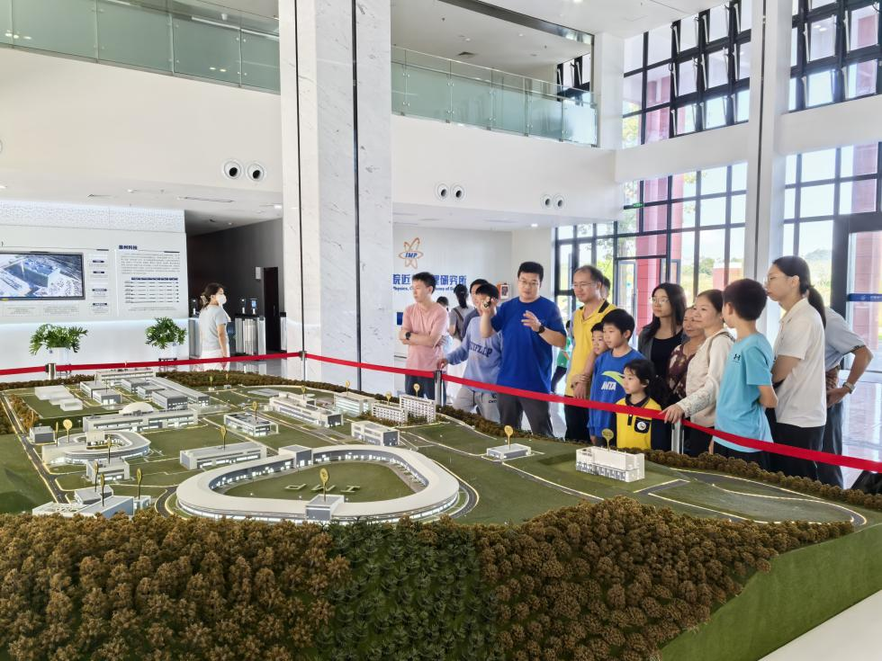 市民參觀強(qiáng)流重離子加速器裝置(HIAF)與加速器驅(qū)動嬗變研究裝置(CiADS)沙盤模型。中國科學(xué)院近代物理研究所供圖