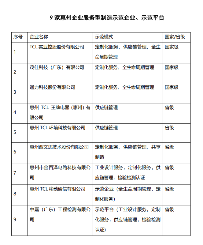 去年,惠州TCL移動通信有限公司、惠州市金百澤電路科技有限公司獲評省級服務型制造示范企業(yè),中嘉(廣東)工程檢測有限公司獲評省級服務型制造示范平臺。