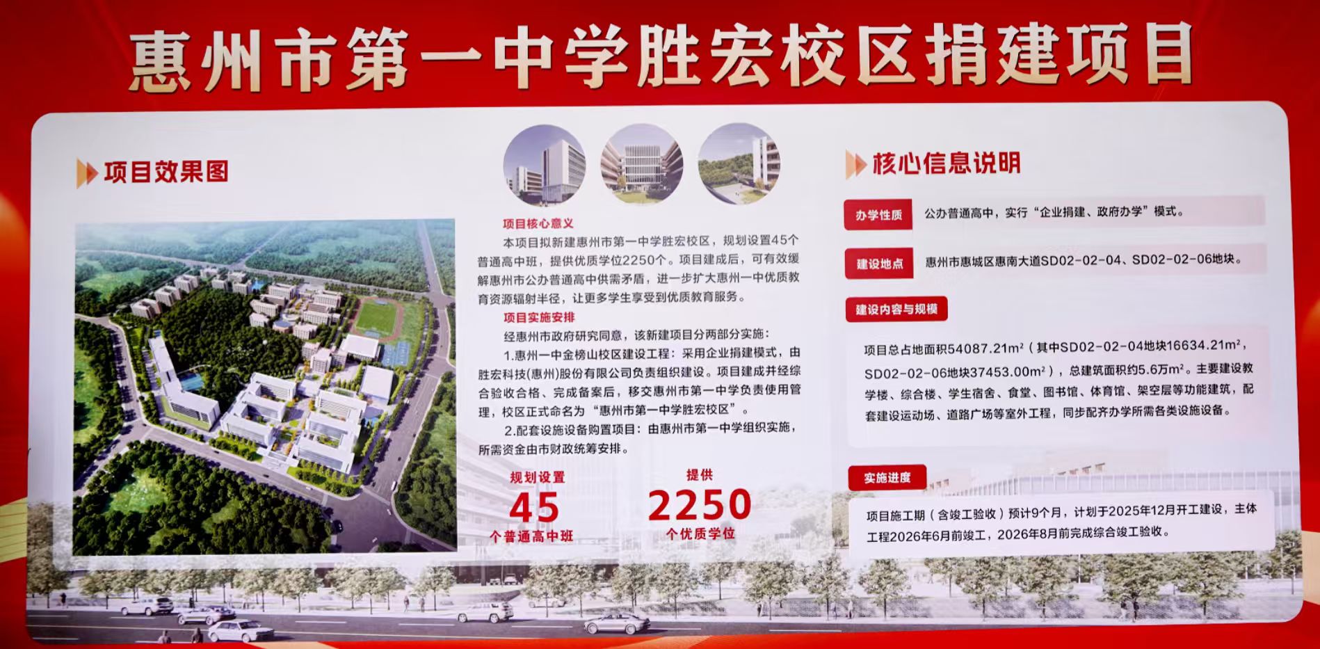 11月27日,勝宏科技(惠州)股份有限公司捐建惠州市第一中學勝宏校區(qū)簽約儀式在惠州市第一中學舉行。項目位于惠州市第一中學金山湖校區(qū)旁,規(guī)劃45個高中班、2250個優(yōu)質(zhì)學位,2025年12月開工,2026年8月前完成驗收移交,將大幅緩解惠州公辦高中學位壓力,讓更多學子享優(yōu)質(zhì)教育資源。