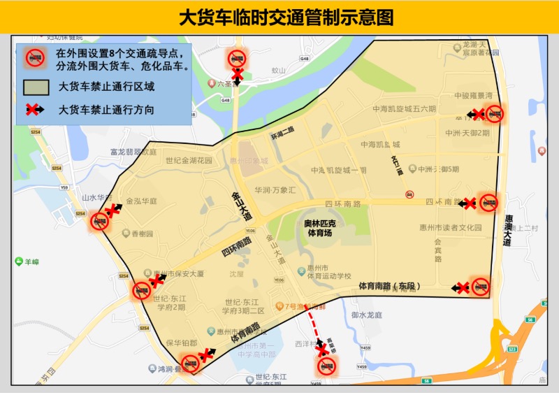 其中,大貨車臨時(shí)管制時(shí)間為12月20日16:00至22:15。期間(管制區(qū)域及措施),奧林匹克體育場(chǎng)周邊環(huán)湖二路、蓓惠路、演達(dá)大道、惠澳大道、體育南路合圍區(qū)域,禁止核載4.5噸以上貨車、危險(xiǎn)化學(xué)品運(yùn)輸車輛通行。