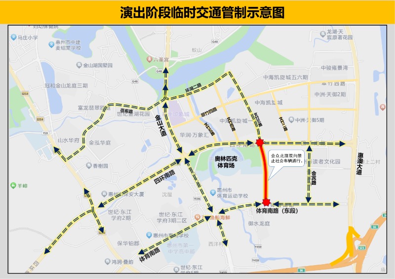 入、散場(chǎng)階段管制時(shí)間為12月20日18:45至19:30,以及21:00至22:15。期間,金山大道(環(huán)湖二路-體育南路段)雙向禁止社會(huì)車輛通行。四環(huán)南路(冷水坑掉頭口-文竹三路段)雙向禁止社會(huì)車輛通行。體育南路(金山大道-會(huì)眾北路段)東往西方向禁止社會(huì)車輛通行。會(huì)眾北路雙向禁止社會(huì)車輛通行。