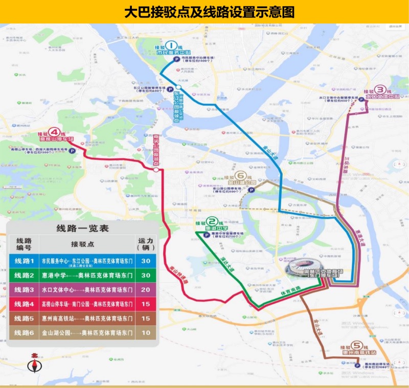 演唱會(huì)當(dāng)天,市區(qū)設(shè)置6條大巴車接駁線路。其中,線路1為江北街道市民服務(wù)中心、東江公園停車場(chǎng)(文昌二路公交站)往返奧林匹克體育場(chǎng)東門;線路2:為南岸街道惠港中學(xué)停車場(chǎng)往返奧林匹克體育場(chǎng)東門;線路3為水口街道文化體育中心停車場(chǎng)往返奧林匹克體育場(chǎng)東門;線路4為龍豐街道高榜山停車場(chǎng)、南門公園往返奧林匹克體育場(chǎng)東門;線路5為三棟鎮(zhèn)惠州南高鐵站(文思一路)往返奧林匹克體育場(chǎng)東門;線路6為河南岸街道金山湖公園停車場(chǎng)往返奧林匹克體育場(chǎng)東門。