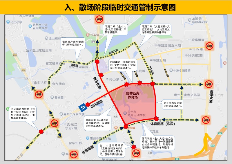 惠州公安交管部門提醒,請(qǐng)前往惠州奧林匹克體育場(chǎng)的觀眾盡量選擇大巴車接駁出行,到就近的接駁點(diǎn)換乘大巴往返。請(qǐng)途經(jīng)車輛提前規(guī)劃好行車線路,避開上述交通管制路段出行,以免交通擁堵。