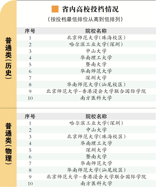 記者梳理2023年廣東高考本科批次投檔情況發(fā)現(xiàn),與2022年相比,在普通類(物理),華南農(nóng)業(yè)大學(xué)跌出十強(qiáng),由北京師范大學(xué)-香港浸會(huì)大學(xué)聯(lián)合國(guó)際學(xué)院取代。南方醫(yī)科大學(xué)上升1位。深圳大學(xué)超越暨南大學(xué)、華南師范大學(xué),首次進(jìn)入前五。前四位中,哈爾濱工業(yè)大學(xué)(深圳)、華南理工大學(xué)繼續(xù)穩(wěn)坐第一和第四,中山大學(xué)超越北京師范大學(xué)(珠海校區(qū))沖到了第二位。