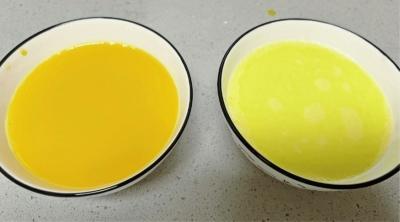 記者實測對比,左邊為濃縮雞蛋液,兌水后呈橙色;右邊為兩枚雞蛋,攪拌并兌水后呈黃色,顏色相差較大。