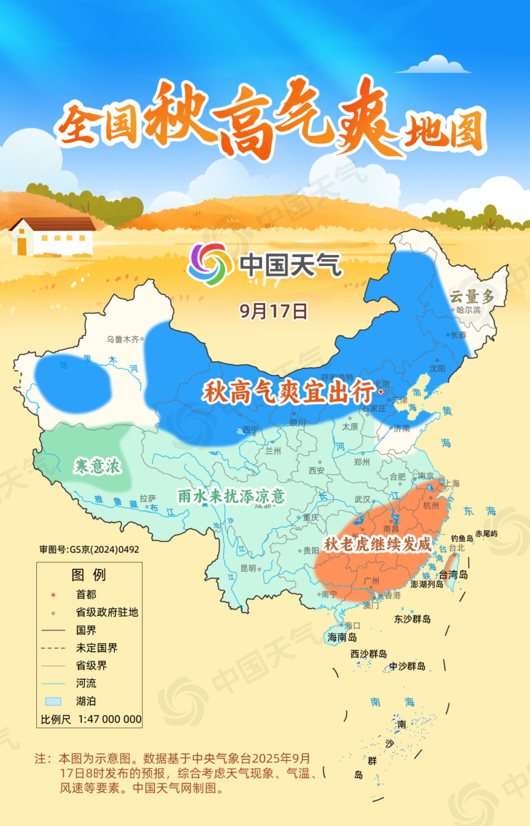 爽在體感舒適。進(jìn)入秋季,副熱帶高壓也逐漸減弱東退,暖濕氣流減弱,空氣變得干爽、暑熱漸消。常年9月,東北大部、西北地區(qū)東部及新疆等地平均最高氣溫均在20℃至26℃之間,體感舒爽。除此之外,秋季我國冷空氣活動雖然頻繁,但總體強(qiáng)度比冬季弱,因此涼風(fēng)習(xí)習(xí),體感舒適。